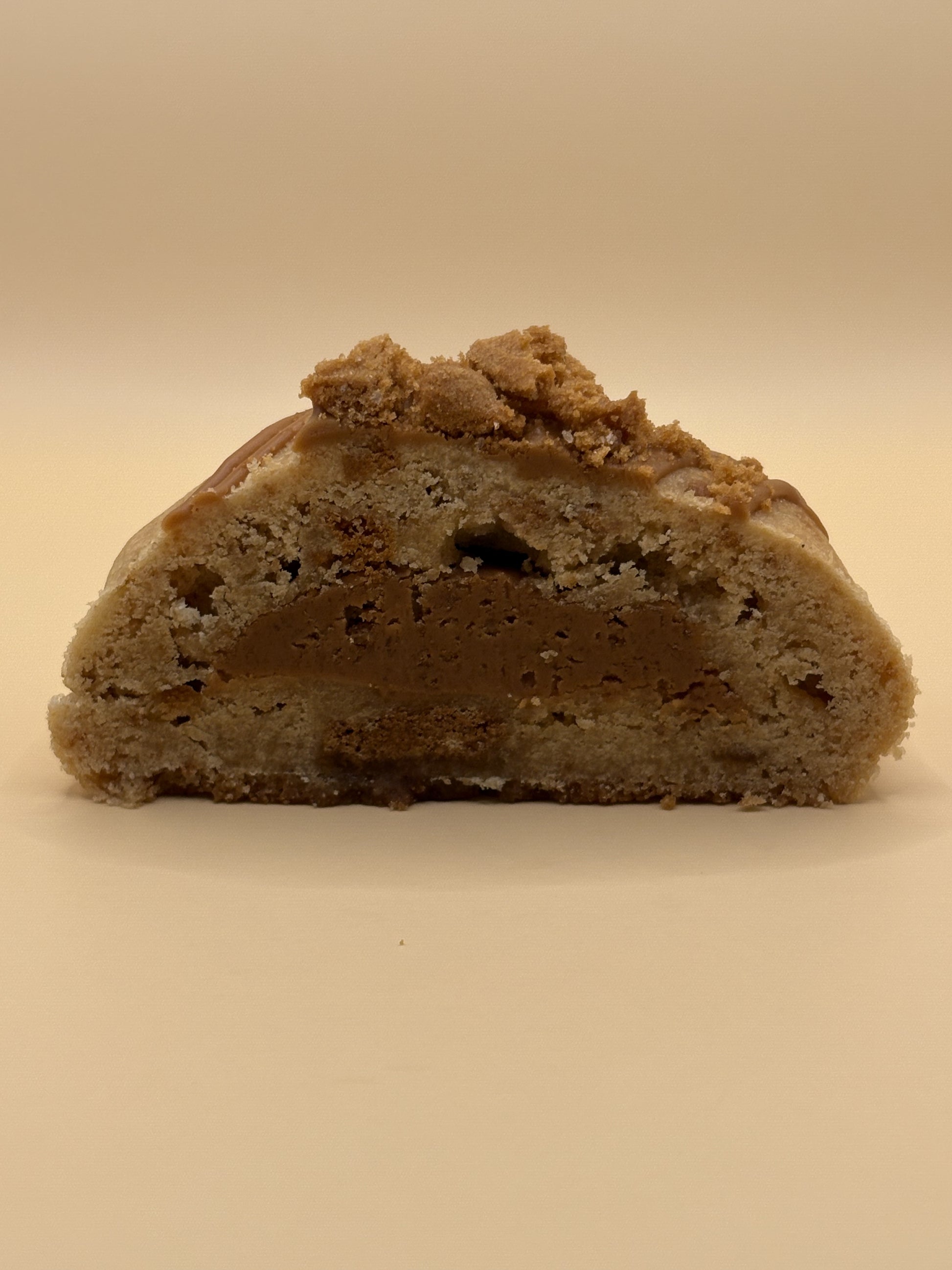 120g of delicious, thick, chunky choc chip cookie injected with biscoff spread. Think white chocolate chips, crushed biscoff biscuits and biscoff spread, giving you that rich cookie butter flavour!